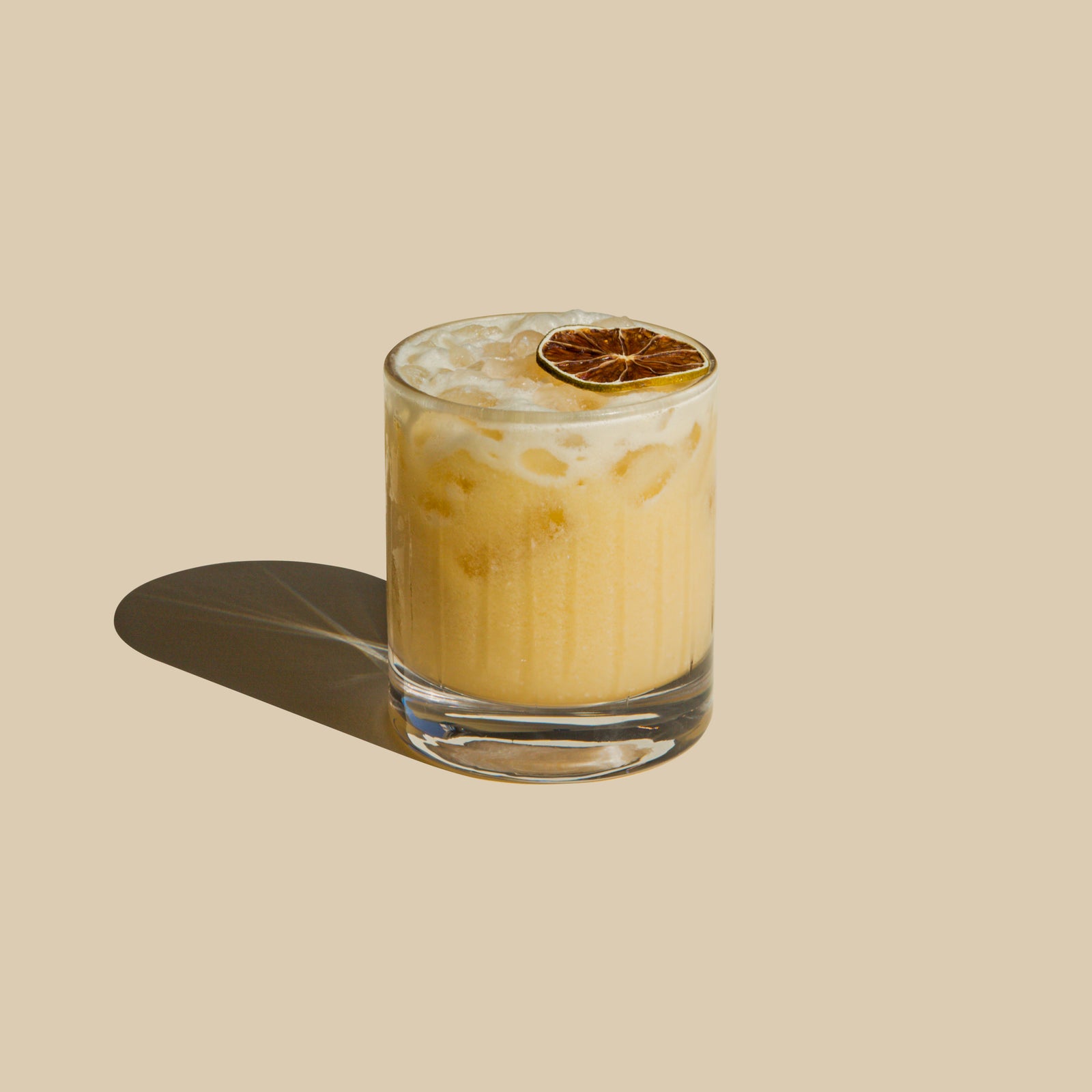 Add all ingredients. Shake thoroughly. Pour into a lowball. Foam will separate and develop naturally. Garnish with dried lime wheel.