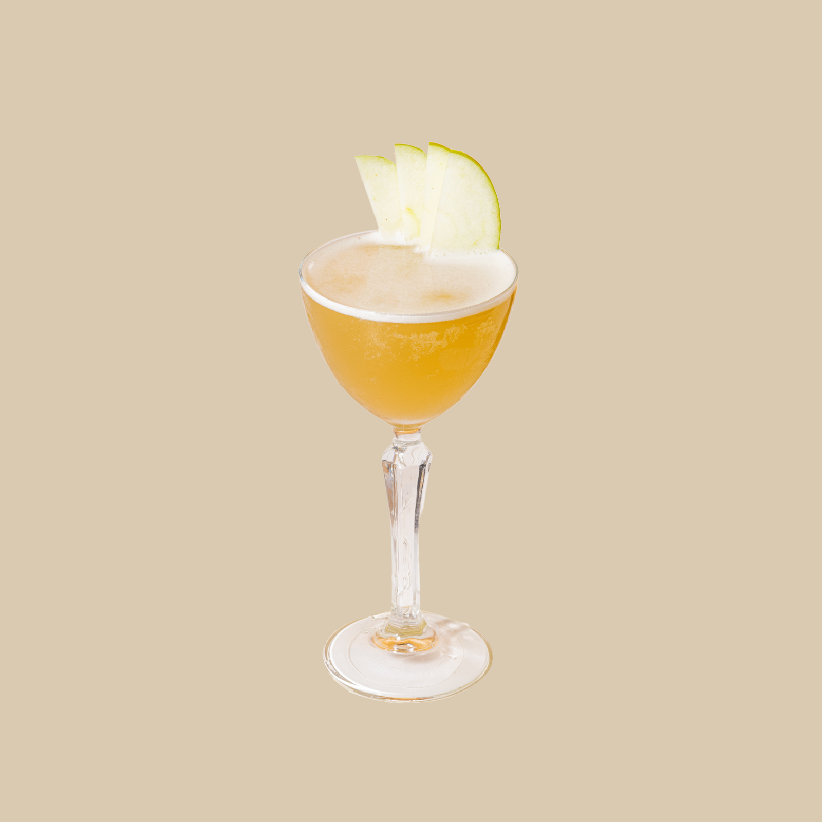 Shake all ingredients in a shaker tin with ice. Double strain into a Nick & Nora glass and garnish with an apple fan.