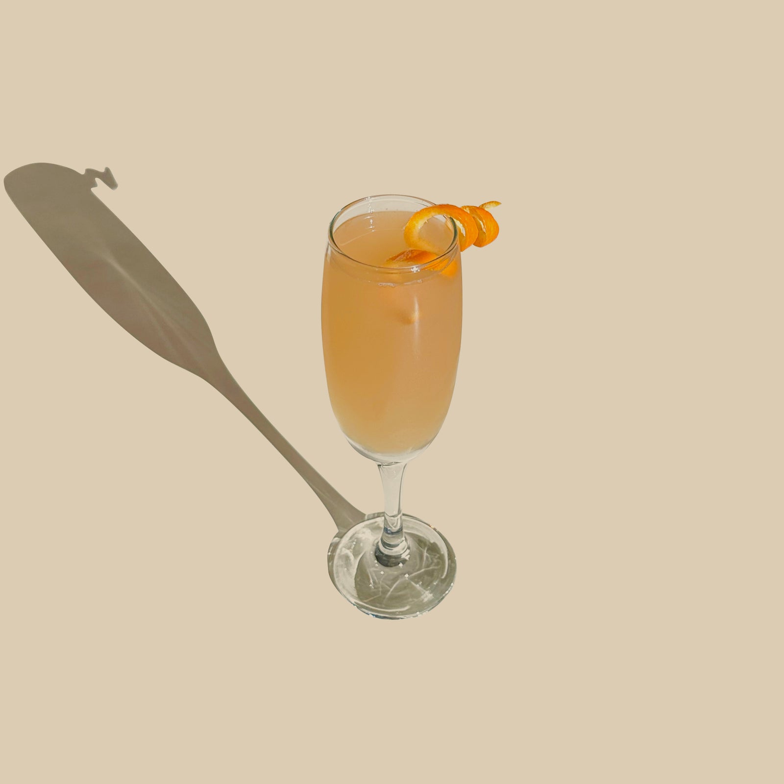 Add all ingredients into a shaker tin with ice and shake. Strain into a champagne flute or coupe glass and top with sparkling wine. Garnish with an orange twist.