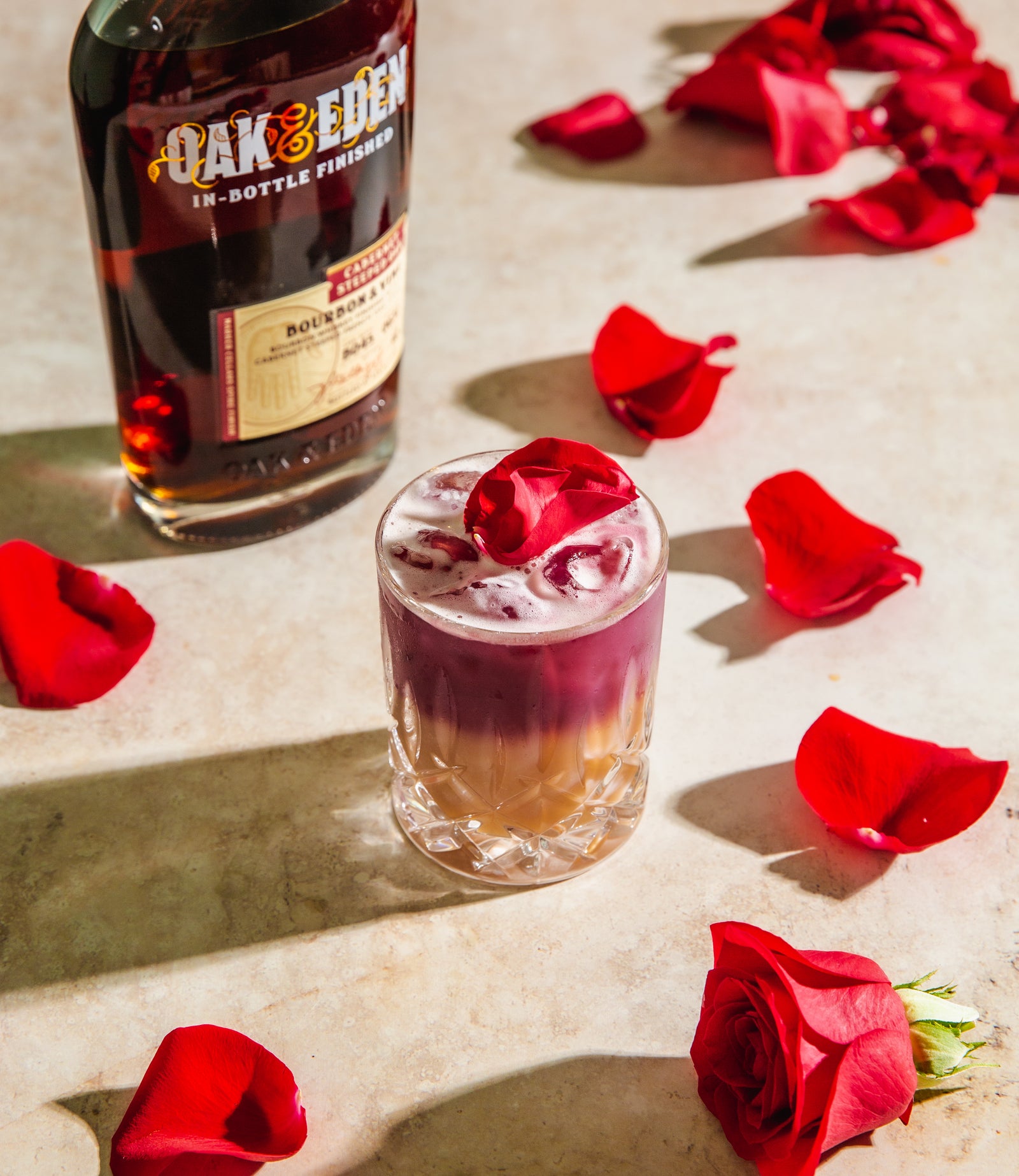 Put all ingredients into a shaker glass and dry shake. Add ice and then shake again. Strain over ice. Top with a red wine float. Top with a rose petal or your preferred garnish.