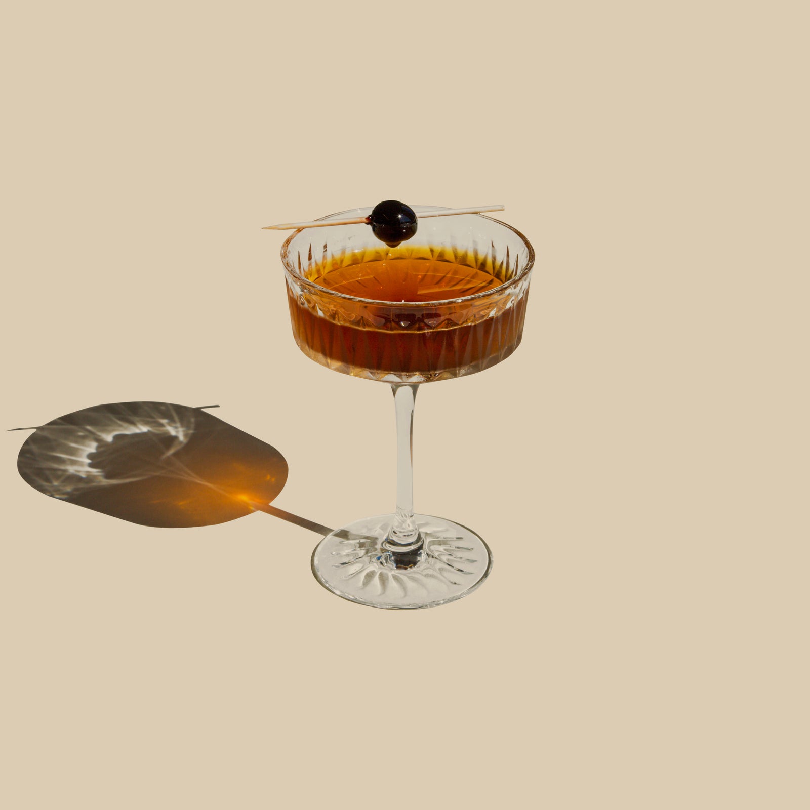 Add all ingredients into a stir glass with ice and stir until chilled. Pour into a chilled coupe and garnish with a cocktail cherry.