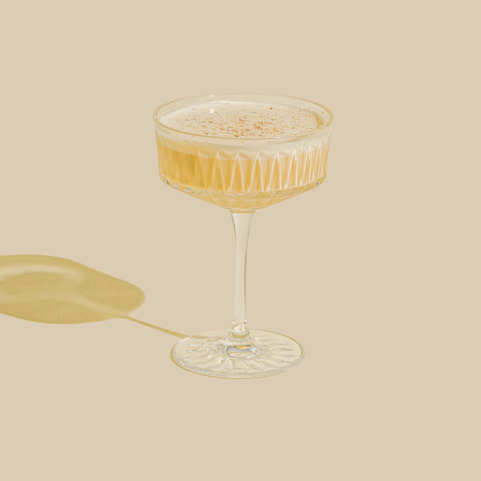 Dry shake all the ingredients, then shake again with ice. Double strain into a chilled coupe. Garnish with a few grates of nutmeg.