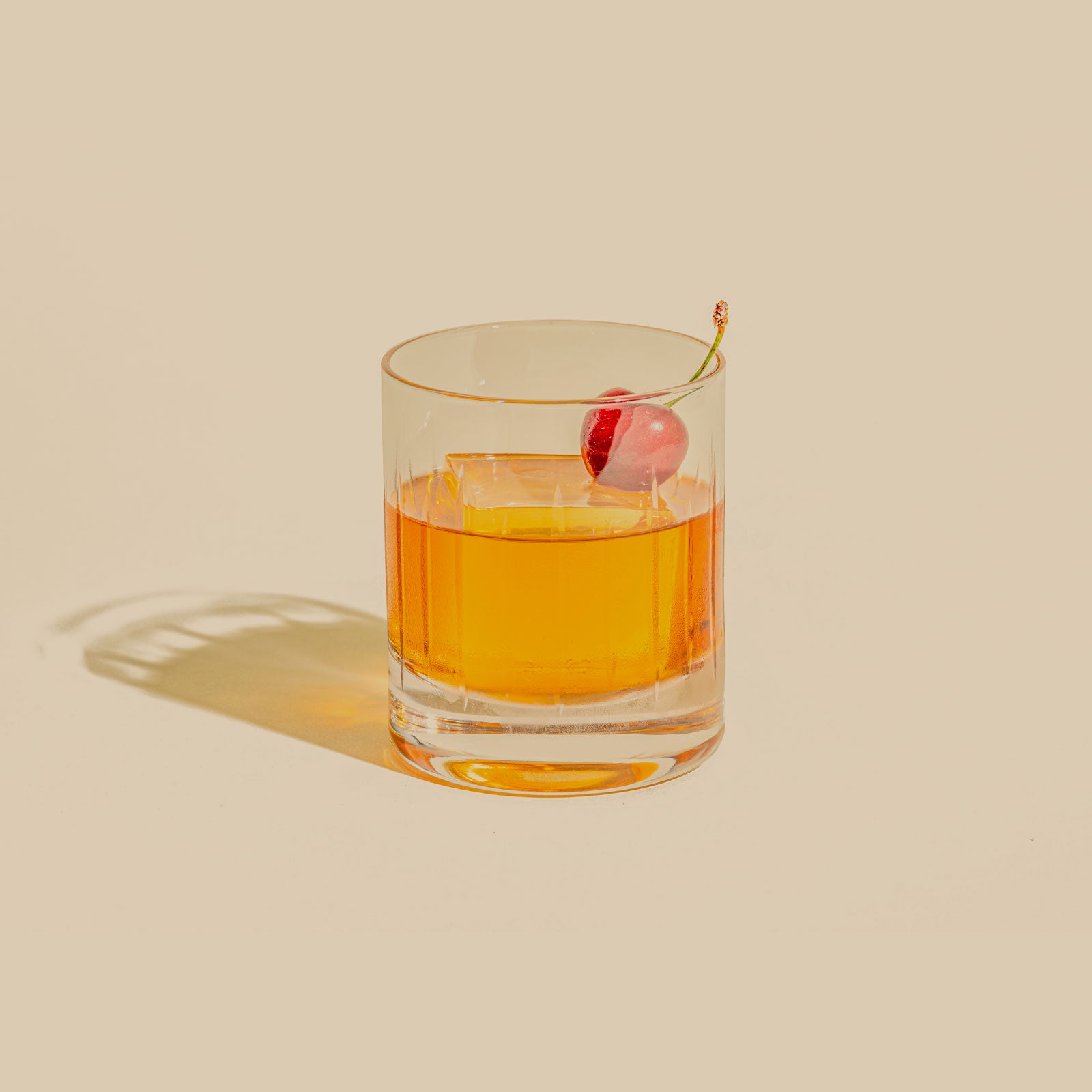 Stir all ingredients in a mixing glass with ice. Strain into a rocks glass with a large ice cube and garnish with the cherry.