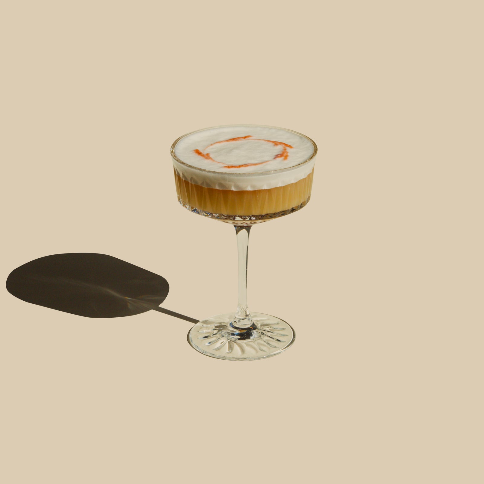 Reverse dry shake all ingredients in tin and double strain into coupe. Drop in cocktail cherry, zest lemon and discard twist.