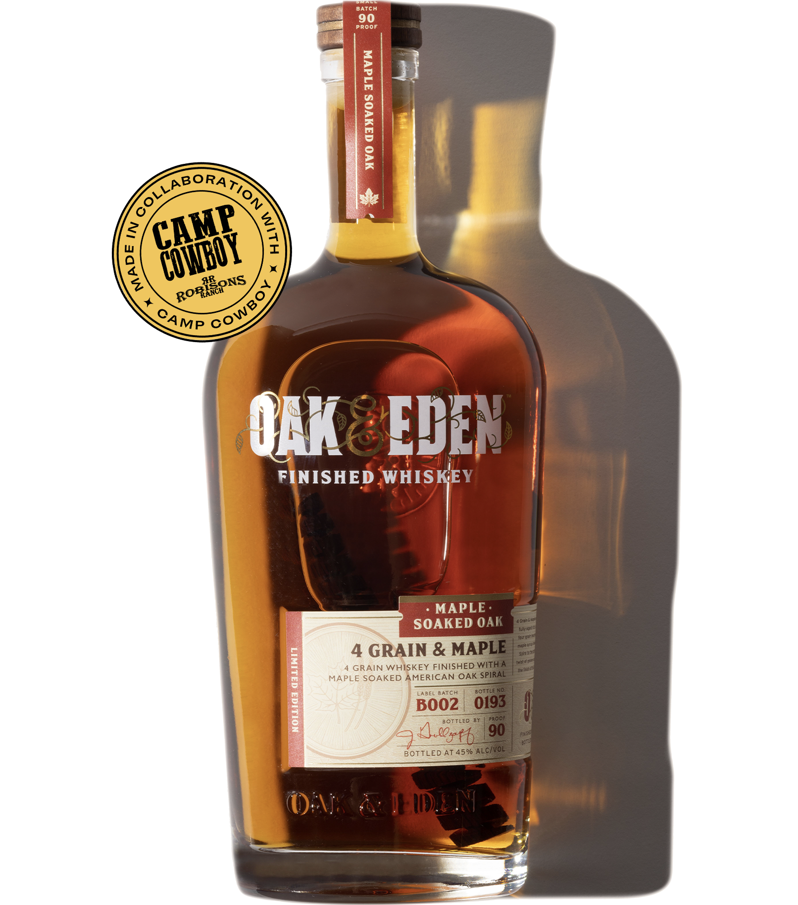 We partnered with Camp Cowboy to release this exclusive limited edition Oak & Eden x Camp Cowboy bottle of 4 Grain & Maple. 4 Grain & Maple is a 90 proof four grain bourbon finished with a maple infused American Oak spire.